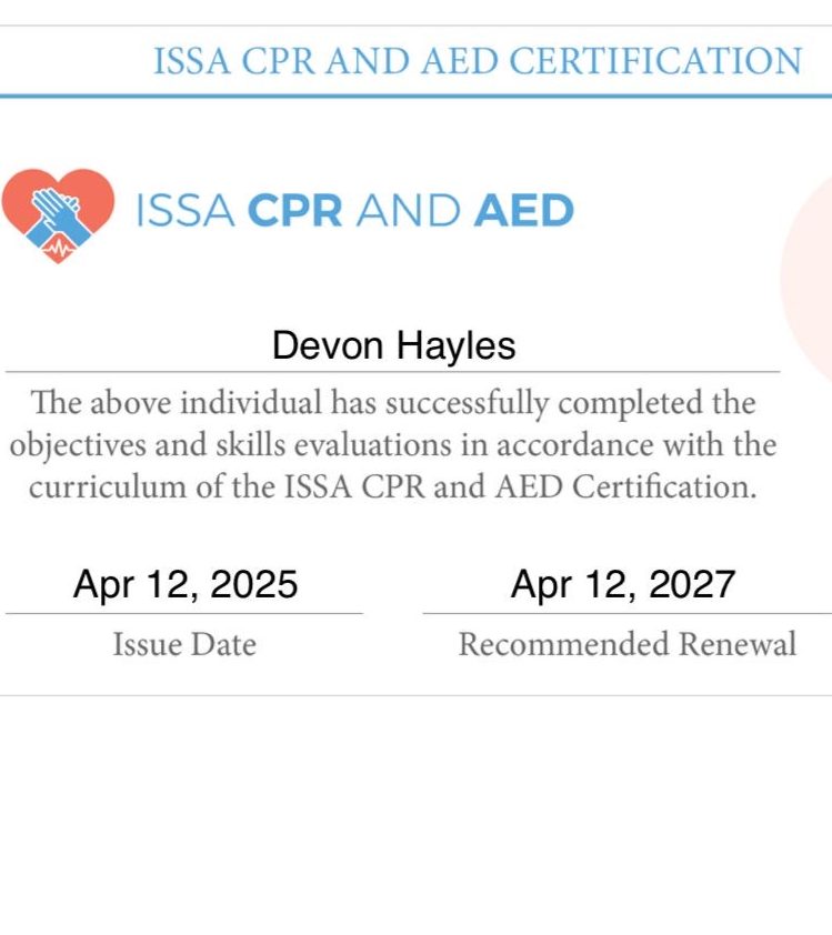 Devon is certified by ISSA (International Sports Sciences Association)